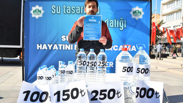 Aksaray Belediyesi tarafından vatandaşlara su tasarrufu içeren broşürlerde dağıtıldı. Su tezgahına gelerek suyun kıymetine dikkat çekmek isteyen Osman Çekiç (35) ise 100 TL verip 0,33 ml su satın aldı. Çekiç, hayatında ilk defa bu kadar pahalı bir su aldığını belirterek, “Bence suyun kıymetini bilmek gerekir. Suyu lütfen tasarruflu kullanalım. Su her şey, hayat demektir” dedi.