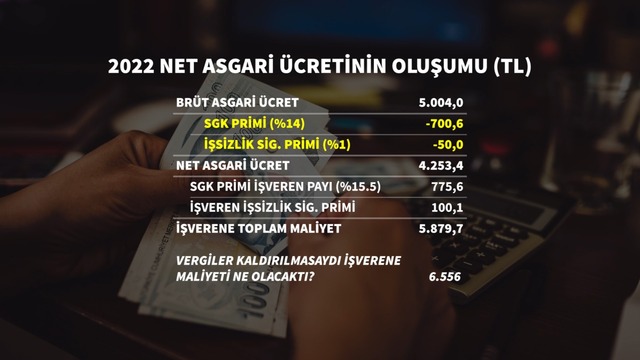2022 yılı için brüt asgari ücret 5 bin 4 TL olacak. Nette bu rakam 4 bin 253 lira 40 kuruşa karşılık geliyor.