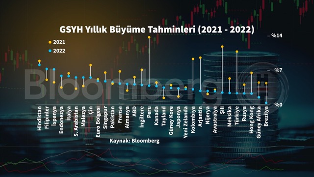 Bloomberg anketlerine göre 2022 yılında küresel ekonominin, 2021’de beklenen yüzde 5,8’lik büyüme performansı üzerine yüzde 4,4’lük bir rakamla büyüme ivmesi sürecek. 2023 ve sonrasında ise uzun dönemli yüzde 3,5’luk seyre dönülmesi bekleniyor.