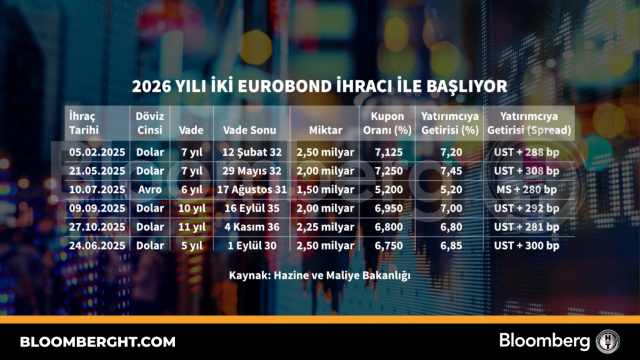 Bloomberg HT Grafik 2026 yılı iki eurobond ihracı ile başlıyor 2026 yılı iki eurobond ihracı ile başlıyor Giriş: 07 Ocak 2026, Çarşamba 20:05 Güncelleme: 07 Ocak 2026, Çarşamba 20:05