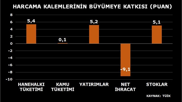 3. çeyrekte büyümeye en yüksek katkıyı özel tüketim ve yatırımlar verirken, net dış talep ise büyümeyi aşağı çekti. Buna göre özel tüketimden 5,4, yatırımlardan 5,2, devletin nihai harcamalarından 0,1 ve stoklardan 5,1 pozitif katkı gelirken, net dış talep büyümeyi 9,1 puan aşağı çekti.