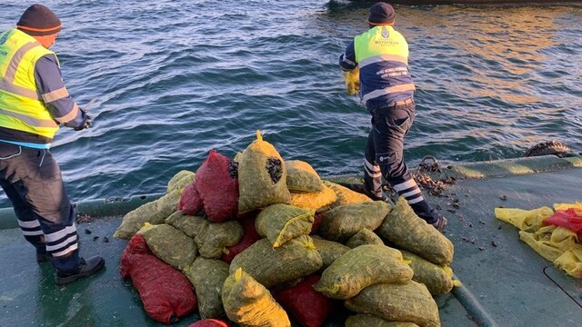 Bayrampaşa Sebze ve Meyve Hali’nde kaçak avlanıldığı belirlenen 150 çuval içerisinde toplam 5 ton kara kıllı midye ele geçirildi.