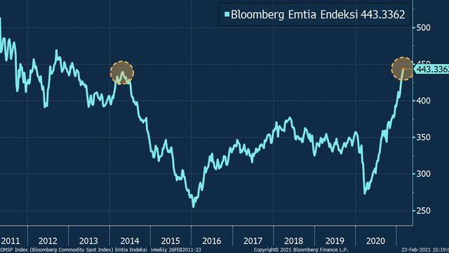 23 ürünü kapsayan Bloomberg Emtia Endeksi hafta başında yüzde 1,6 yükseldi ve 2013 yılının Mart ayından bu yana en yüksek seviyeye ulaştı. 2020 yılı Mart ayında 4 yılın en düşüğünden toparlanan endekste artış bu dönemde yüzde 67’ye ulaştı.