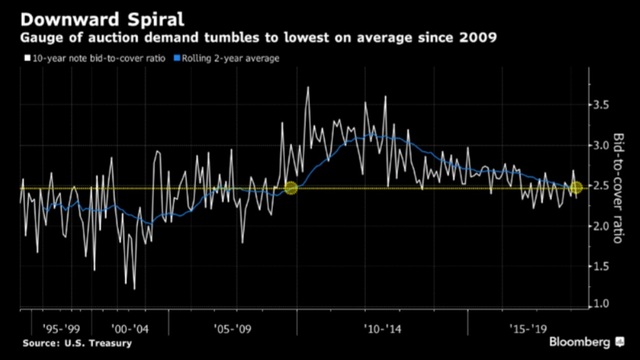 Yatırımcıların sunduğu teklifler ile satılan tahvil miktarı dikkate alındığında, 10 yıllık kağıtlara olan ortalama talep 2009 yılının Ekim ayından bu yana en düşük seviyeye inmiş durumda.