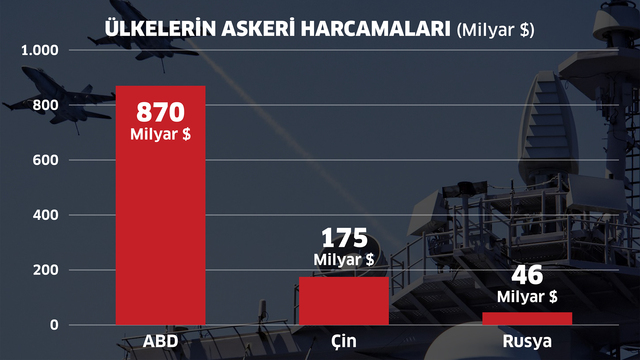 2018 yılında ABD'nin askeri harcamalara 870 milyar dolar, Çin'in 175 milyar dolar ve Rusya'nın 46 milyar dolar bütçe ayırması bekleniyor