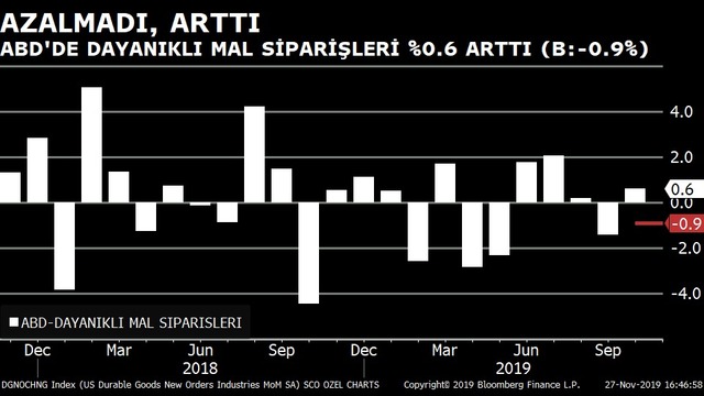 ABD Ticaret Bakanlığı'nın verilerine göre dayanıklı tüketim malı siparişleri Ekim'de % 0.6 arttı.