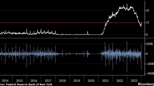 Fed'in kısa vadeli faiz oranlarını kontrol etmek için kullandığı önemli araçlardan biri olan ters repo sistemi (RRP) 2022 sonunda gördüğü rekor seviye olan 2,5 trilyon dolar seviyesinden, Fed'den faiz indirim beklentilerinin artmasıyla eridi. Ters repoda park eden akıllı para piyasalara geri dönerse ne olur?