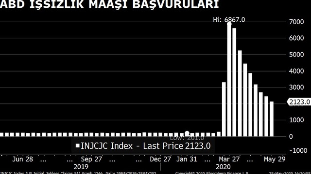 İşsizlik maaşı başvuruları 23 Mayıs'ta biten haftada 2.12 milyon kişi oldu ve bununla birlikte 2.5 aylık dönemde bu imkandan faydalanmak için başvuranların toplam sayısı 40 milyonun üzerine çıktı. Bloomberg'in anketine katılan ekonomistlerin tahminlerinin medyanına göre bu verinin 2.1 milyon seviyesinde çıkması bekleniyordu.