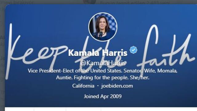 Sonuçların netleşmesiyle ABD'de ilk kadın siyahi başkan yardımcısı olacak Kamala Harris de sosyal medya platformu Twitter'daki profilini güncelleyerek 'Seçilmiş ABD Başkan Yardımcısı' unvanını kulllandı.