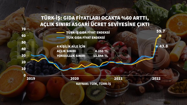 Açlık sınırı 4 bin 250 lira yeni yılın ilk asgari ücretine yetişti. Ocak'ta gıda enflasyonu aylık yüzde 3,71, yıllık ise yüzde 59,67 oldu. Yoksulluk sınırı da 13 bin 844 liraya ulaştı. Bekar bir çalışanın yaşam maliyeti 5 bin 587 lira olarak hesaplandı.