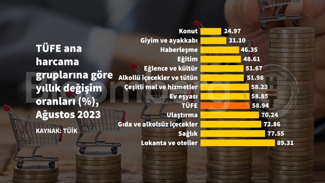 Ana harcama gruplarına bakıldığında bir önceki yılın aynı ayına göre en yüksek artış yüzde 89,31 ile lokanta ve otellerde görüldü. Bu grubu yüzde 77,55 ile sağlık, yüzde 72,86 ile gıda ve alkolsüz içecekler izledi. Bir önceki yılın aynı ayına göre en az artış gösteren ana grup yüzde 24,97 ile konut oldu.