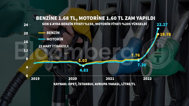 23 Mart tarihinden itibaren geçerli olmak üzere İstanbul'da benzinin litre fiyatı 1,68 TL artışla 19,78 TL'ye yükseldi.