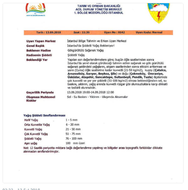 Meteoroloji İstanbul için bir flaş uyarı da daha bulundu. Yapılan uyarıda, "İstanbul'da akşam saatlerinde başlayacak yağışların gece saatlerinde etkisini arttırması beklendiğinden, özellikle Sarıyer, Beşiktaş, Beykoz, Şile, Ümraniye, Üsküdar, Maltepe, Kartal, Pendik ve Tuzla ilçelerinde sel riski bulunmaktadır." denildi.