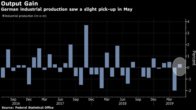 Almanya'da sanayi üretimi Mayıs ayında hafifçe artarak Avrupa'nın en büyük ekonomisinde küresel ticaret gerginliği ve cansız taleple karşı karşıya olan imalatçılara ilişkin nadir görülen istikrar sinyali verdi.