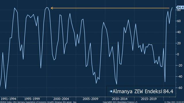 Almanya’da ZEW ekonomik beklentiler endeksi koronavirüs aşılamasının hızlanmasıyla Mayıs’ta 70.7’den 84.4’e ulaştı. Bu, 2000 yılından beri görülen en yüksek seviye oldu.