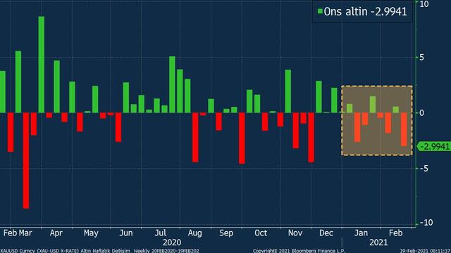 Altın, geçen sene salgınla beraber düşen faiz oranları ve teşvik harcamalarıyla 2020’yi yüzde 24 civarında rekor bir kazançla kapatmıştı. 2021 yılına da yüksek beklentilerle giren altın, ilk 6 haftanın 4’ünü kayıpla kapattıktan sonra bu haftayı 2021’in en büyük kaybıyla kapatmaya hazırlanıyor.