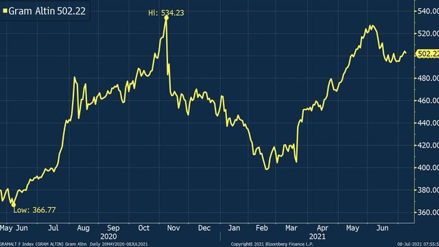 Nisan ve Mayıs’ta küresel altın fiyatları ve dolar/TL’deki yukarı yönlü hareketi takip ederek istikrarlı bir yükseliş kaydeden gram altın, Haziran başında 527 TL’ye ulaşarak bu yılın zirvesini görmüştü. Sonrasında küresel altın fiyatlarındaki gerilemeyi takip eden gram altın, Haziran ortasından bu yana dar bir fiyat aralığında seyrediyor.