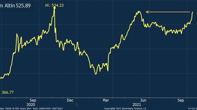Gram altın, küresel altın fiyatları ve dolar/TL’nin birbirini dengelemesiyle yaklaşık 1 ay dar bir fiyat aralığında işlem gördükten sonra Eylül ayının ortalarından itibaren kademeli bir şekilde yükselmeye başladı. Küresel altın fiyatlarındaki yükselişe ek olarak dolar/TL’nin rekor yüksek seviyelere ulaşmasından destek bulan gram altın, Temmuz ayında gördüğü zirveyi aşarsa 2021’in en yüksek seviyesine çıkmış olacak.