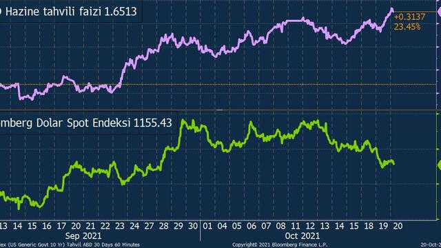 10 yıl vadeli ABD Hazine tahvili faizi yüzde 1,56 seviyesine kadar çekildikten sonra 9 baz puan yükselişle yüzde 1,65 seviyesine tırmandı. Doların en çok işlem gördüğü para birimlerine karşı performansını ölçen Bloomberg Dolar Spot Endeksi ise hafta basından bu yana yüzde 0,4 civarında bir düşüşle 1.155 seviyesine indi.