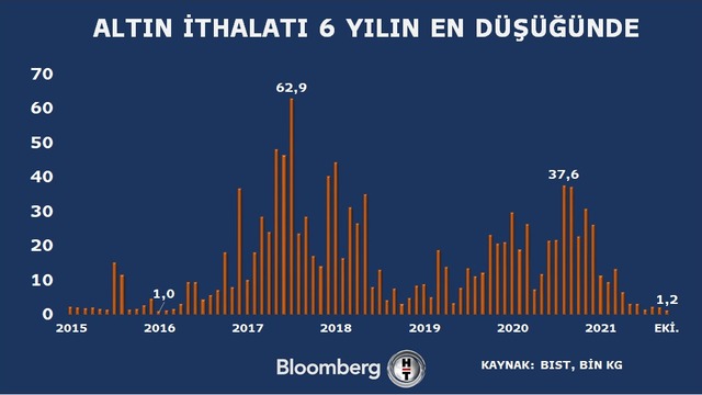 Türkiye'nin altın ithalatı Ekim'de 1.213 kg ile Ocak 2016'dan bu yana en düşük seviyeye geriledi. Güncel fiyatla ithalat rakamı 72 milyon dolar düzeyinde bulunuyor.