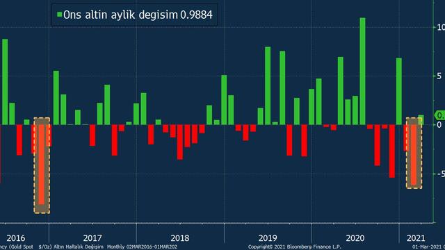 Altın, Şubat ayında yükselen tahvil faizleri ve güçlenen ABD dolarından dolayı son 2016 yılının Kasım ayından sonraki en kötü ayını geçirdi. Gram altın ise 435 TL civarında başladığı Şubat ayını 414 TL seviyesinde kapattı.