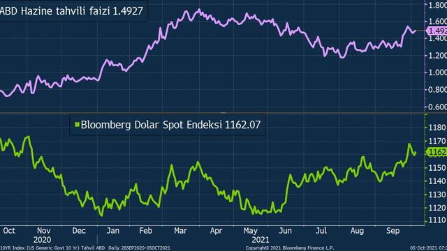 10 yıl vadeli ABD Hazine tahvili faizi 3 baz puan yükselişle yüzde 1,49 seviyesine çıkarken Bloomberg Dolat Spot Endeksi de 1.159’dan 1.162’ye tırmandı.