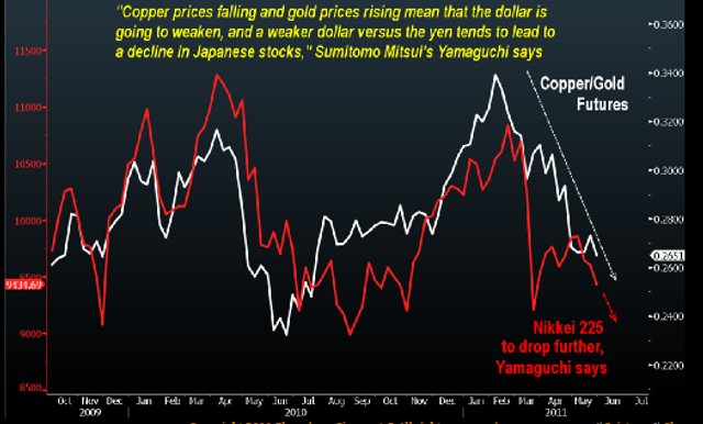 Bakır-altın rasyosu geçen yılın zirvesine 15 Nisan'da ulaştıktan sonra yüzde 28 düşerek, 8 Haziran'da geçen yılın en düşük seviyesine indi. Nikkei Endeksi 5 Nisan'da ulaştığı geçen yılın zirvesinden yüzde 22 düşerek, 31 Ağustos'ta 2010 yılının en düşük seviyesine indi.