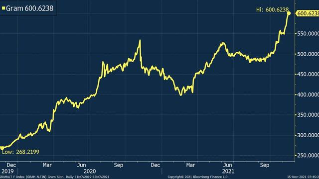 Gram altın, dolar/TL’nin cuma günü 10 seviyesine ulaşması ve küresel altın fiyatlarındaki yükselişle beraber 600 TL’nin üzerini görmüştü. Gram altın, dolar/TL’nin yeni haftaya 10 seviyesinin üzerinde başlaması ve küresel altın fiyatlarındaki yüksek seyirle 600 TL’nin üzerindeki seyrini koruyor.