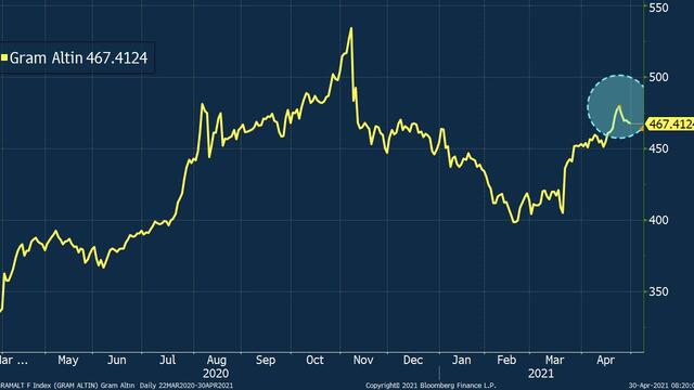 Nisan ayına 453 TL civarında başlayan gram altın, dolar/TL ve küresel altın fiyatlarının aynı anda yükseldiği hafta 481 TL’ye ulaşarak bu yılın zirvesini gördü. Dolar üzerinden fiyatlanan gram altın, dolar/TL’nin Nisan ayında yatay seyretmesiyle küresel altın fiyatlarındaki yükselişi takip ederek yüzde 3,1 değer kazandı.