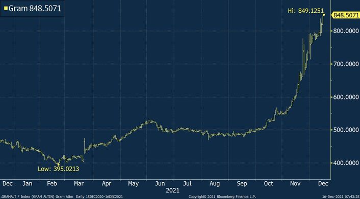 Gram altın, küresel altın fiyatlarındaki yükseliş ve dolar kurunun 14,76 seviyesini görmesiyle perşembe günü 849 TL ile yeni bir zirve görmüş oldu.