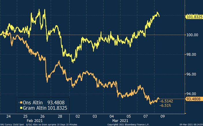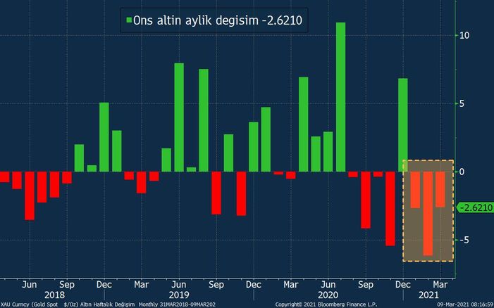 Altın fiyatları, 2021’in ilk 2 ayını kayıpla kapattıktan sonra Mart ayı başından bu yana yüzde 2,62 değer kaybetti. Dünya Altın Konseyi ise altının şu an emtia enflasyonundan dolayı düşük bir performans sergilediğini ve bunun ardında 36 aylık bir yüksek performans döneminin geleceğini belirtiyor.