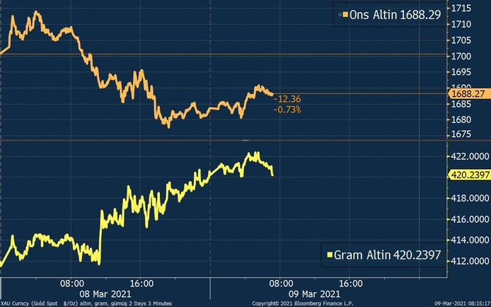Altın fiyatları, yükselen ABD Hazine tahvili faizleri ve güçlenen dolar ile 35 dolara yakın düşüş yaşadıktan sonra, salı günü mali teşvik paketi beklentileriyle 1.690 dolar civarına yükseldi. Gram altın ise dolar/TL’deki yükselişin küresel altın fiyatlarındaki düşüşten ağır basmasıyla değer kazandı.