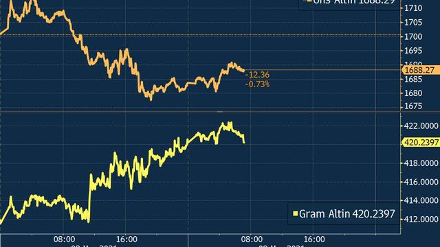 Ons altın, yükselen tahvil faizleriyle hafta başından bu yana yüzde 0,73 değer kaybederken salı günü TSİ 08:04’te 1.688 dolar seviyesinde işlem görüyor.