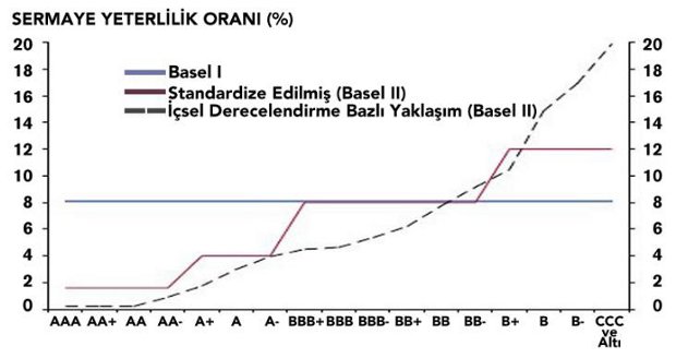 Basel I’e baktığımızda 5 ayrı risk grubu varken, Basel II’de çarpıcı nokta ise risk ağırlıklarının belirlenmesinde kredi derecelendirme kuruluşlarının kullanılmasıdır. Kredi derecelendirme kuruluşlarının bankalara, şirketlere ve ülkelere verdikleri notlarla bankaların sermaye yükümlülükleri üzerine kararlarının korelasyonu belirli şekilde artacağı şüphesiz.