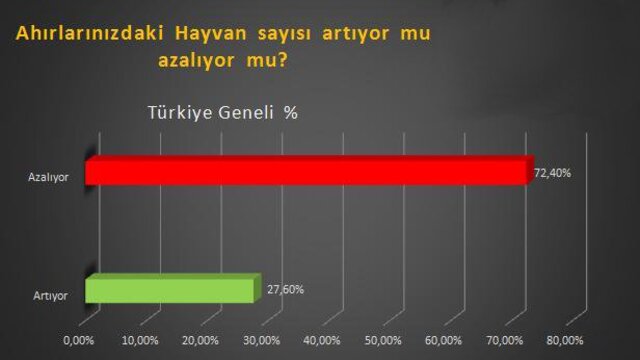 Ankete katılan 1,292 çiftçiye sorulan “Ahırlarınızda hayvan sayısı artıyor mu? Azalıyor mu?” sorusuna yüzde 72.40 oranında ‘Azalıyor’ cevabı verilmiş.