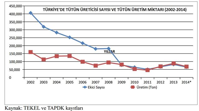 Raporda 2002-2014 yılları arası sektör açısından ‘büyük bir tasfiye süreci’ olarak nitelendirilirken, 2002’de 405 bin 882 olan tütün üreticisi sayısının 2014 yılı itibarıyla yüzde 600 azalarak 65 bine gerilediği hatırlatılıyor. Yine aynı dönemler için Türkiye’de tütün üretiminin yüzde 200 azalarak 159 bin 521 tondan yaklaşık 68 bin ton civarına gerilediğine dikkat çekiliyor.