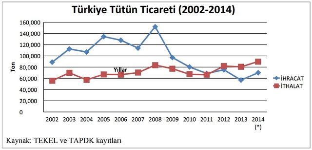 Türkiye, 2014 yılında yaklaşık 70 bin ton tütünü 525 milyon dolar karşılığında ihraç etti. 2002 yılından itibaren Türkiye’de üretilmeye başlanan Amerikan blend sigaralar için 55 bin 800 ton ile başlayan tütün ithalatında ise 2014 yılında rekor kırılarak yaklaşık 90 bin tona ulaşıp 550 milyon dolar ödendi. Kısacası 2002’den bu yana tütün ithalatındaki artış yüzde 161’e ulaştı.