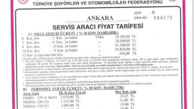 Buna göre okul servis ücreti yıllık 0-3 km arası 16 bin 745 TL, 3-6 km arası 18 bin 450 TL, 6-10 km 21 bin 320 TL, 10 -15 km arası ise 24 bin 810 TL oldu.