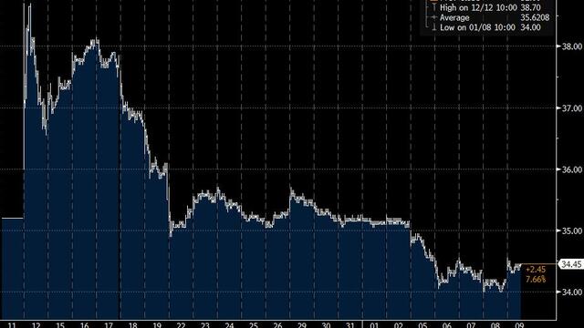 Halka arz fiyatı 32 riyal ile pazarlama aralığının en üstünden belirlenen Aramco hisseleri, 38.70 dolara kadar yükselmesinin ardından genellikle aşağı yönlü bir seyir izledi.