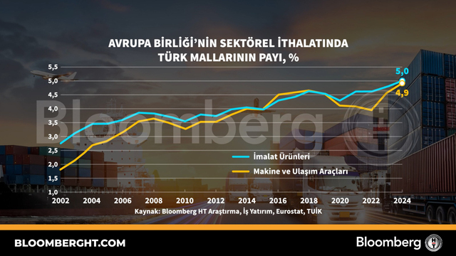 Bloomberg HTGrafikAvrupa Bi̇rli̇ği̇'ni̇n sektörel i̇thalatında Türk mallarının payı
