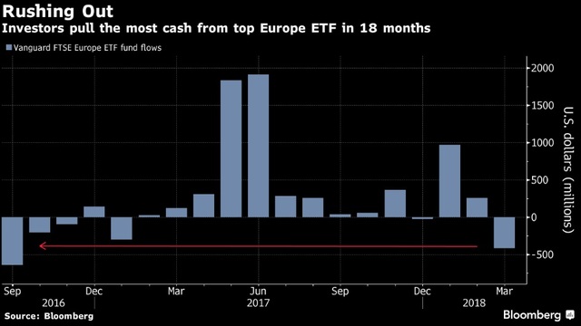 Yatırımcılar, Vanguard FTSE Europe exchange traded fonundan (ETF) Mart'ta 417 milyon dolar ile Eylül 2016'dan bu yana en sert aylık çıkışı gerçekleştirdi.