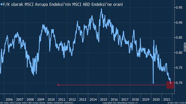 MSCI Avrupa Endeksi, MSCI ABD Endeksi’ne göre yüzde 30 iskontolu işlem görürken iki endeks arasındaki fiyat farkı daha önce hiç bu seviyelere çıkmamıştı. Avrupa hisseleri, gelecek döneme dair fiyat kazanç oranı beklentilerine göre ABD hisseleri karşısında rekor ucuz seviyede bulunuyor.