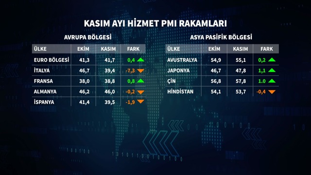Almanya'da hizmet PMI Kasım'da 46 puan ile 46.2'lik beklentinin bir miktar altında kaldı. Fransa'da 38.8 ile 38'lik beklentiyi aştı. Ancak 50 seviyesindeki eşik değerinin bir hayli altında gerçekleşmiş oldu.