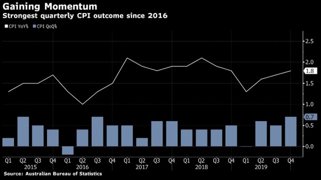 Avustralya İstatistik Bürosu tarafından Çarşamba günü açıklanan verilere göre, tüketici fiyat endeksi, yılın son çeyreğinde üçüncü çeyreğe oranla yüzde 0.7 yükseldi. Beklenti yüzde 0.6 yükselmesi yönündeydi ve endeks bir önceki senein aynı döneminde yüzde 1.8 seviyesinde gerçekleşmişti.