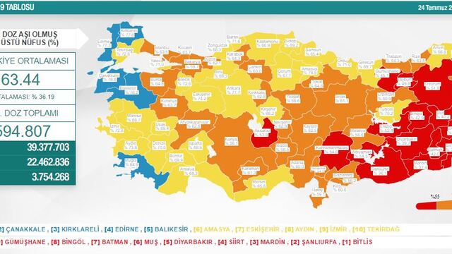 En az bir doz aşı yapılanların oranının en az olduğu iller ise Bitlis, Şanlıurfa, Mardin, Siirt, Diyarbakır, Muş, Batman, Bingöl, Gümüşhane ve Iğdır olarak sıralandı.