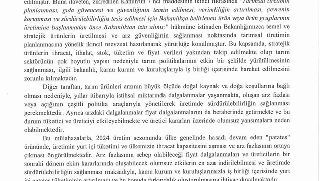 "Patates Tüketiminde Farkındalığın Artırılması" konu başlığı ile hazırlanan resmi yazıda, "Tarım ürünleri arzının büyük ölçüde doğal kaynak ve doğa koşullarına bağlı olması nedeniyle, yıllar itibariyle istihsal miktarında dalgalanmalar yaşanmakta, oluşan arz fazlası veya açığının çeşitli politika araçlarıyla yönetilerek üretimde sürdürülebilirliğin sağlanması gerekmektedir. Ayrıca arzdaki dalgalanmalar fiyat dalgalanmalarını da beraberinde getirmekte ve bu durum tüketici ve üreticiyi etkileyebilmekte ve üretici kararları üzerinde olusmsuz yansımalara neden olabilmektedir" ifadelerine yer verildi.