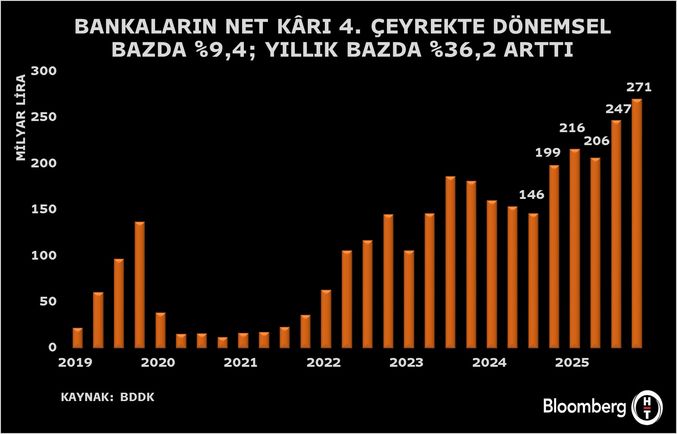 Bankaların 4. çeyrekte dönemsel bazda kârları yüzde 9,4 artarken, yıllık bazda da 36,2 yükseliş gösterdi.