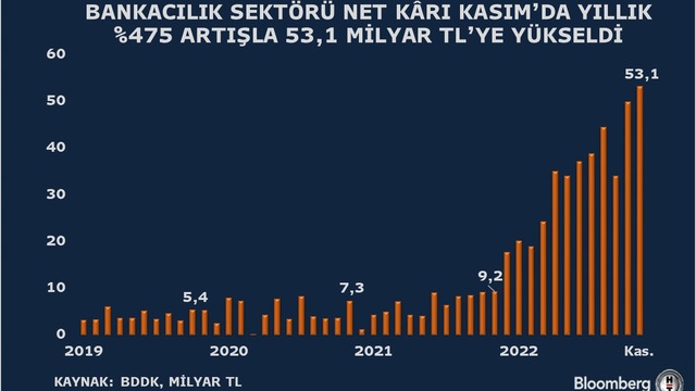 Bankacılık sektörünün Kasım ayında net kârı bir önceki yılın aynı dönemine göre yüzde 475 artışla 53,1 milyar TL oldu.