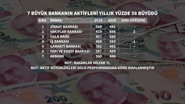 Türkiye'de bankacılık sektörü 2020'de dalgalı bir dönemi geride bırakırken, aktif büyüklüğüne göre banka sıralaması da değişti. Ziraat Bankası 2020'de ilk sırayı korurken, 2019'da 4. sırada yer alan Vakıfbank ikinci sıraya yükseldi. Son gelen bilançolara göre Türkiye'de banka liginde ilk üç sırayı kamu bankaları oluşturdu. Böylelikle son 5 yılda ilk kez büyüklük sıralamasında ilk üç sırayı kamu bankaları oluşturdu