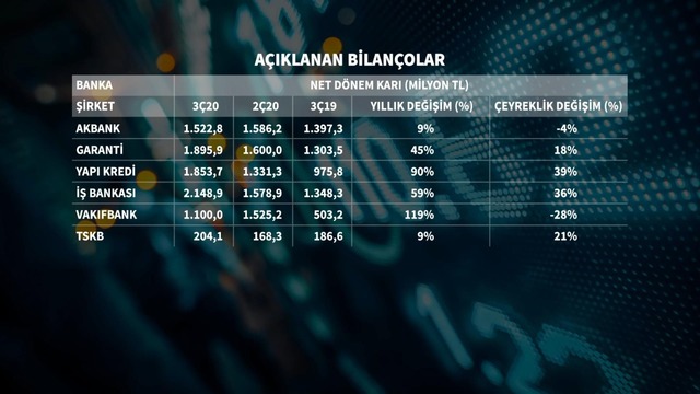 Garanti BBVA’nın 2020 yılının üçüncü çeyreğindeki net dönem karı bir önceki çeyreğe göre yüzde 18,5 oranında artarak 1,9 milyar TL’ye yükseldi. İş Bankası’nın 2020 yılının üçüncü çeyreğindeki net dönem karı bir önceki çeyreğine göre yüzde 36,1, bir önceki yılın aynı çeyreğine göre ise yüzde 59,4 oranında artarak 2,2 milyar TL’ye çıktı.